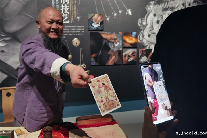 夹江年画四川省级代表性传承人张荣强邀请游客扫码观看AR年画。