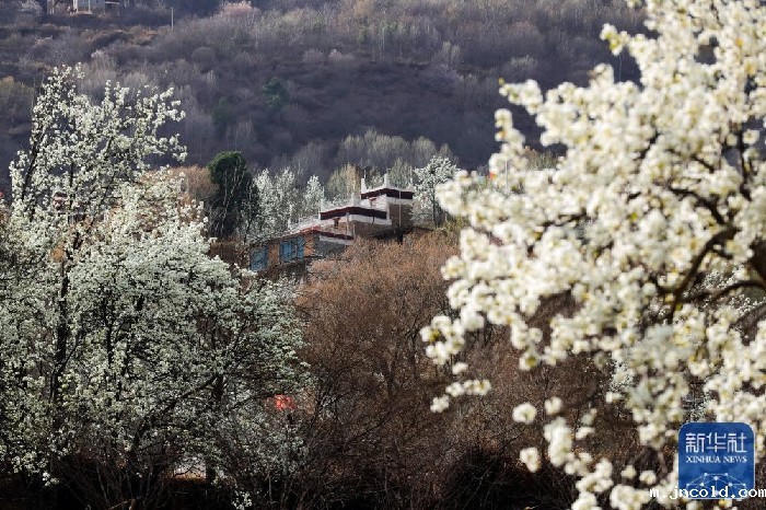 这是3月23日在丹巴县甲居藏寨拍摄的梨花掩映中的藏族民居。新华社记者 沈伯韩 摄