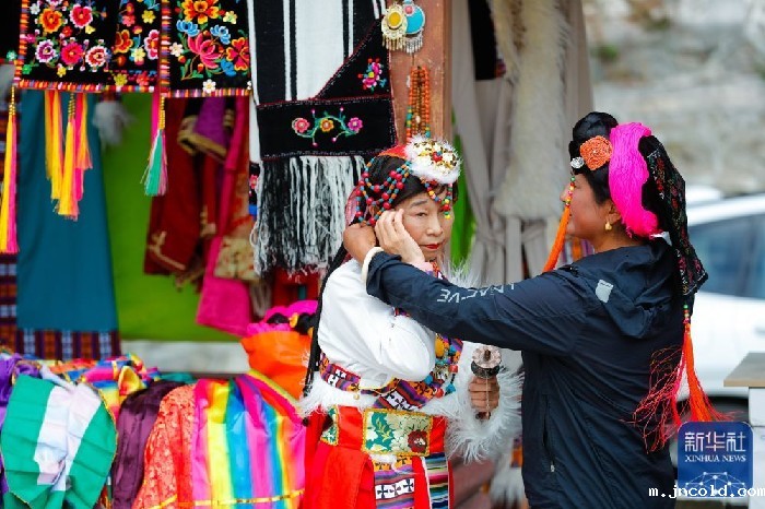 3月23日,在丹巴县甲居藏寨,游客(左)换上藏族服饰准备拍照。新华社记者 沈伯韩 摄