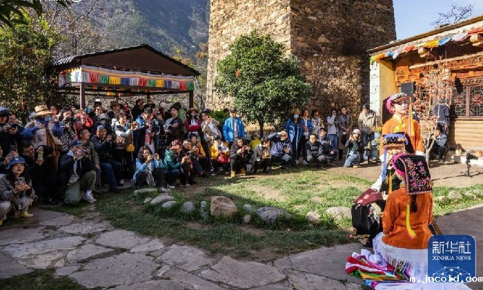 “花开丹巴·为梨而来”2024美人谷·丹巴梨花春赏季活动在丹巴县中路藏寨开启,游人在观赏拍摄嘉绒藏族民俗风情展示(3月21日摄)。 新华社发(何曦摄)