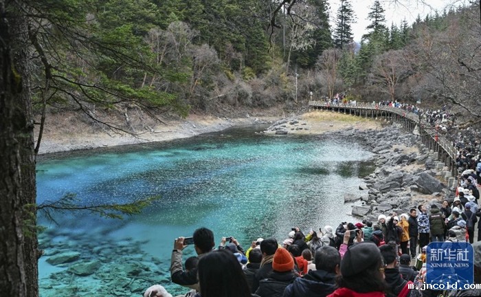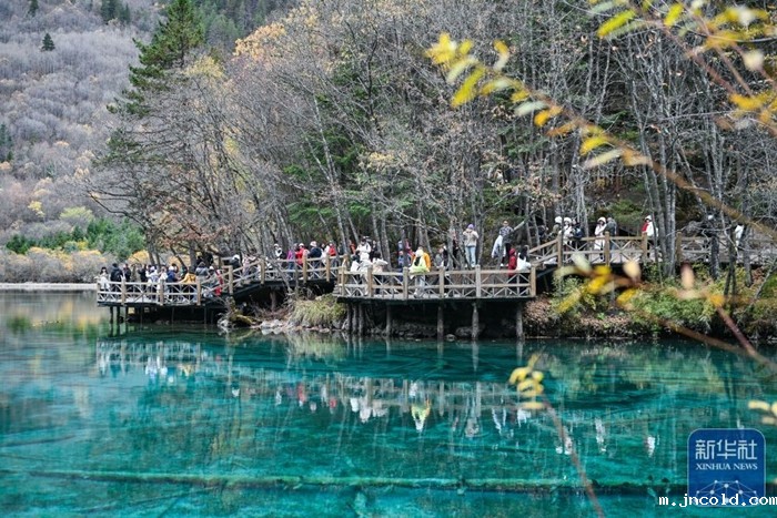 11月16日,游客在九寨沟景区五彩池观光。新华社记者 刘莲芬 摄