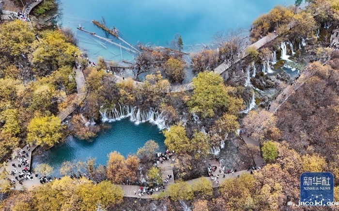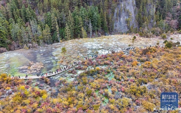 11月16日,游客在九寨沟景区树正群海观光(无人机照片)。新华社记者 刘莲芬 摄