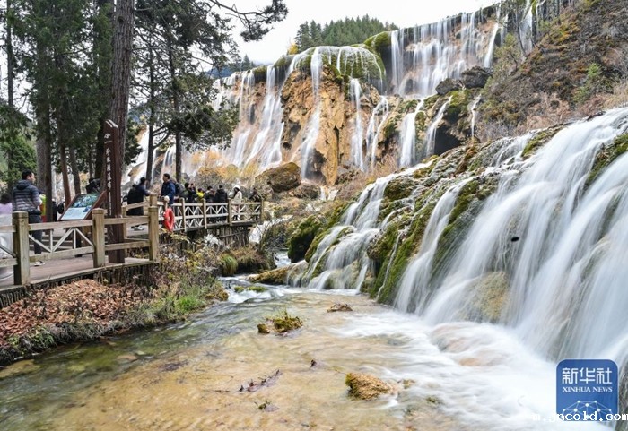 11月16日,游客在九寨沟景区珍珠滩瀑布观光。新华社记者 刘莲芬 摄