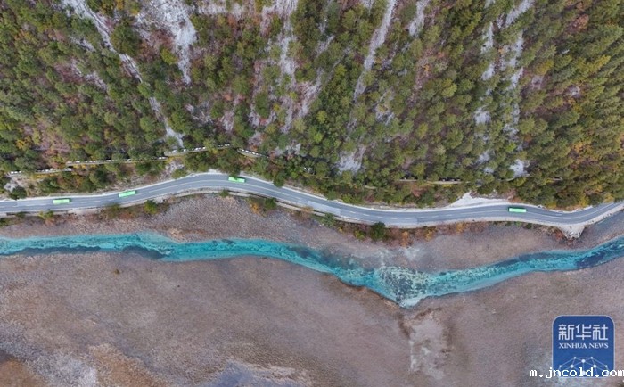11月16日,观光车行驶在九寨沟景区芦苇海旁的公路上(无人机照片)。新华社记者 王曦 摄