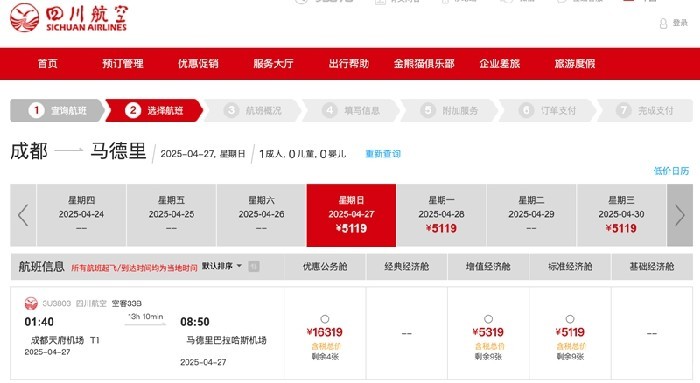 2月19日,记者在川航官网查询发现,目前成都直飞马德里航班机票已上线预售,首航去程含税票价最低为5119元,返程为3112元。据了解,该航线每周执行往返各四班,分别于每周一、三、五、七执飞。去程航班号3U3803,计划于01:40从成都天府国际机场起飞,当地时间08:50抵达马德里巴拉哈斯机场,空中飞行时间13小时10分钟;返程航班号3U3804,计划于当地时间11:05从马德里巴拉哈斯机场起飞,北京时间05:00回到成都天府国际机场,空中飞行时间11小时55分钟。