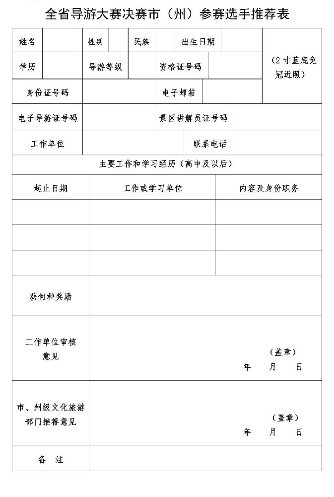 优米娱乐下载各会员导游: 按照《四川省文化和旅游厅办公室关于开展 2020 年全省导游大赛的通知》(川文旅办发〔2020〕20 号)要求,为进一步提升我市导游(讲解员)队伍形象,传播行业正能量,选拔优秀导游(讲解员)人才,为新冠肺炎疫情后旅游行业恢复发展蓄力储能。结合成都市导游(讲解员)队伍实际选拔出业务综合素质高、引领示范作用强的优秀导游(讲解员)推荐参加全省导游大赛决赛,现将相关事宜通知如下: 一、选拔时间 2020 年 5 月 7 日 二、选拔方式 据成都疫情防控情况,各行业协会选拔赛自行组织开展,按分配名额报送选手,市文广旅局 5 月 7 日组织专家开展选拔评审工作,选拔 17 名选手推荐参加全省导游大赛决赛。 三、评审专家 通过成都旅游产业发展专家库抽选 5 名旅游行业专家参与评审选拔工作。 四、推荐选手要求 (一)持有电子导游证且从事导游服务1年以上的导游,或持有景区和文博单位讲解员证且从事讲解服务1年以上的专业讲解员。 (二)参赛前3年内未受到文化和旅游部行政部门行政处罚。 (三)工作期间表现良好,游客评价优良,无重大投诉。 (四)2019年成都百万职工技能大赛导游服务技能竞赛前10名选手由工作单位直接推荐。 (五)各行业协会按名额分配优先推荐2019年成都百万职工技能大赛导游服务技能竞赛11-20名选手。 (六)景区、文博单位讲解员由成都旅游景区协会统一推荐。 五、推荐选手名额分配 协会选送8名选手代表参赛。 六、参赛要求 (一)推荐选手需录制 1 个“家乡美”主题视频短片。内容应包括自我介绍,语言简练,突出特色,有强烈的感染力。(时长 1 分钟,视频格式 1920×1080 像素以上,比例16:9)。 (二)推荐选手需录制 1 个导游讲解短视频,讲解范围四川省 A 级旅游景区、红色旅游、历史文化、民族文化、都市观光、乡村旅游、工农业旅游等旅游项目。要求重点突出,讲解完整。鼓励 选手创作并使用“旅游金句"即用最精练、最经典、最具创意的语言概括对景区的介绍或历史传说、古文化遗存、旅途感悟等内容。同时,讲解内容须包含部分游览消费信息及文明旅游引导,如旅游城市(乡镇)、旅游区(点)周边的餐饮、住宿、娱乐指南等,内容不必面面俱到,选择一点或几点即可,但必须真实具有指导性。(时长 5 分钟,视频格式 MP4、WMV)。 (三)报名会员,请于4月30日 12:00 前将以下资料报送优米娱乐下载办公室(邮箱1517995080@qq.com),联系人周老师13540703095微信同号。 1.选手推荐表电子版。 2.“家乡美”主题视频短片。 3.“导游讲解”视频短片。 特此通知。
