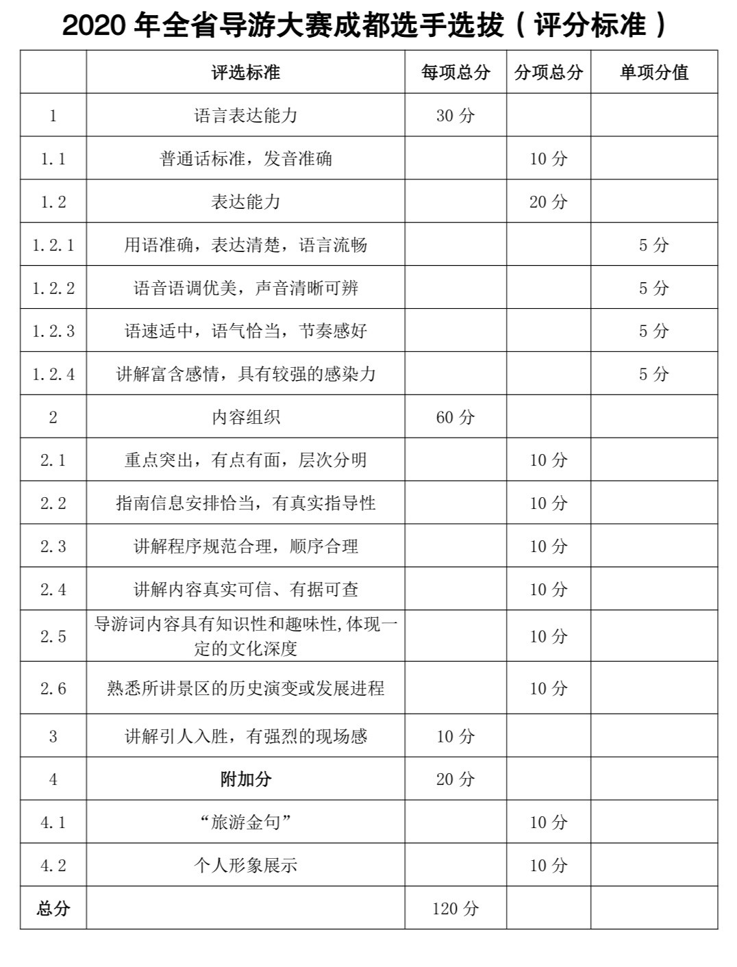 按照《四川省文化和旅游厅办公室关于开展 2020 年全省导游大赛的通知》(川文旅办发〔2020〕20 号)要求,为进一步提升我市导游(讲解员)队伍形象,传播行业正能量,选拔优秀导游(讲解员)人才,为新冠肺炎疫情后旅游行业恢复发展蓄力储能。结合成都市导游(讲解员)队伍实际选拔出业务综合素质高、引领示范作用强的优秀导游(讲解员)推荐参加全省导游大赛决赛,现将相关事宜通知如下: